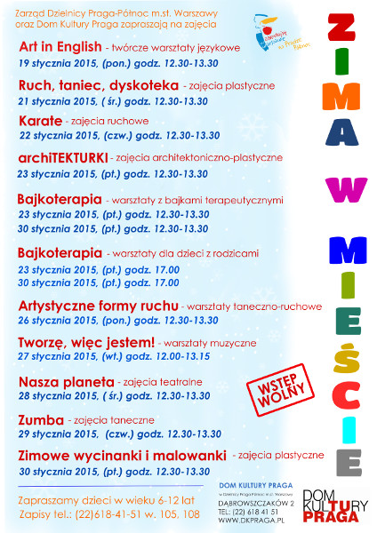 Dom Kultury Praga zaprasza na specjalny program zajęć organizowanych w trakcie ferii zimowych w dniach 19.01 – 30.01 br.