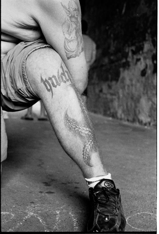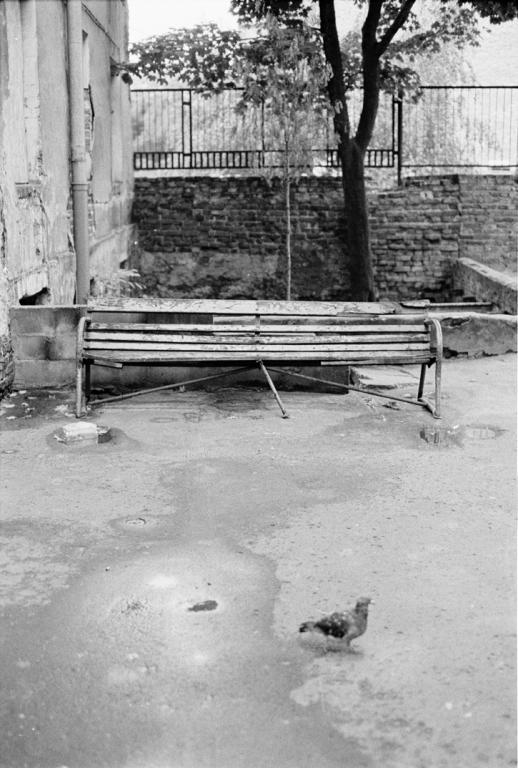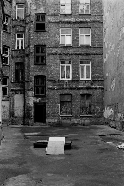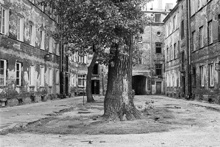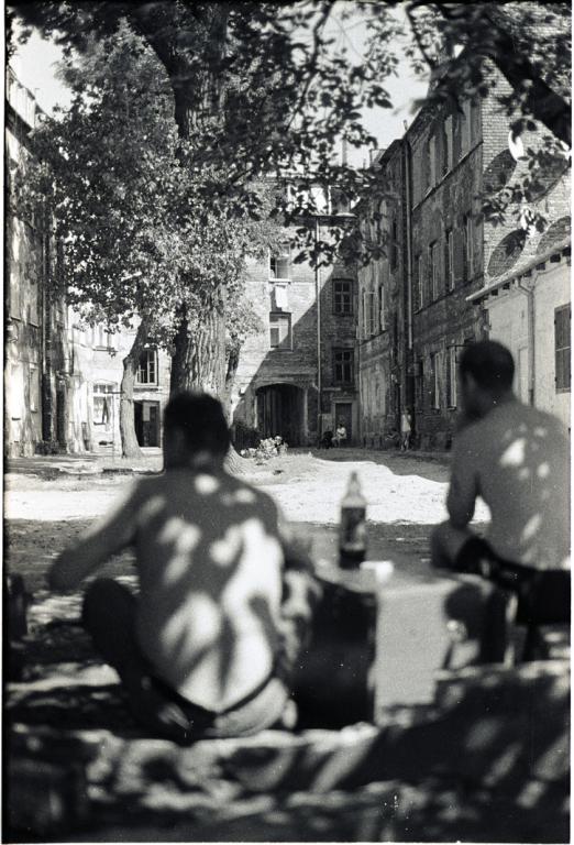 Spędziliśmy pod tym drzewem w sumie kilka dni. Pierwsza scena była tak absurdalna, że nie zdążyłem podnieść aparatu. Na podwórko wpadła biegiem dwójka dobrze ubranych młodych ludzi. Nie pasowali do otoczenia wyglądem i nerwowym zachowaniem. Pobiegli dalej. Chwilę później wpadł na podwórko poszarpany chłopak, rozejrzał się i pobiegł dalej. Z grupy pod drzewem nikt nie zareagował - jakby to była codzienność. Poprosiłem o objaśnienie "co się właśnie stało". Pierwsza dwójka to pacjenci pobliskiego środka leczenia uzależnień, która właśnie skończyła zajęcia a goniący i poszarpany chłopak to diler, którego klienci oszukali i prawdopodobnie pobili. Zwróciłem uwagę na to że wszyscy z pogardą odnosili się do całej trójki. Opowiedzieli mi, że kiedyś handlarze i narkomani "rozpanoszyli się" po okolicy. Żeby ich nie dotykać wyrwali deski i inne części okolicznych elementów i tymi argumentami przekonali ich do pozostania w swojej pierwotnej okolicy. Kilka dni później gdy pojawiłem się w okolicy podbiegł do mnie jeden ze znajomych i ostrzegł że w bramie gdzie będę przechodził leży strzykawka z igłą - żebym uważał.
