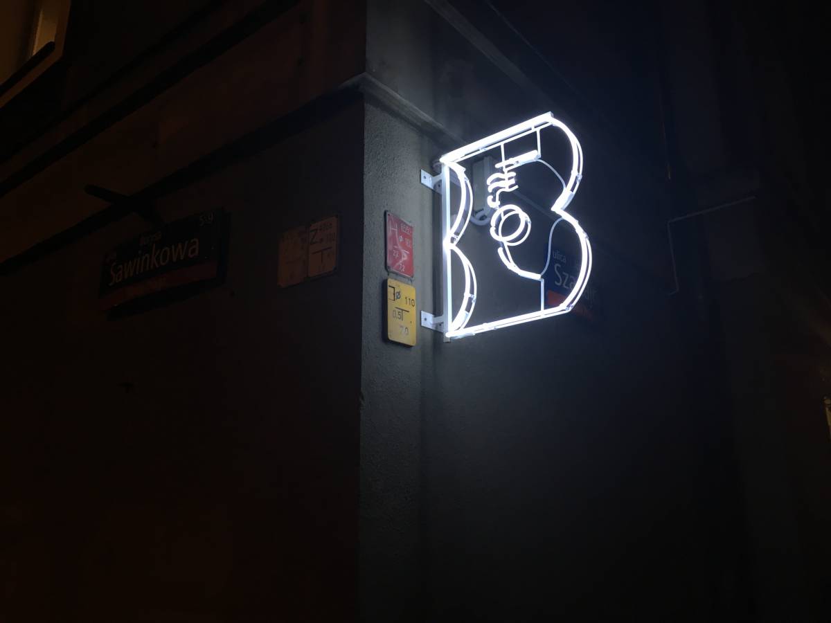 neon przedstawiający nowe logo fot. Stanisław Węgrowski